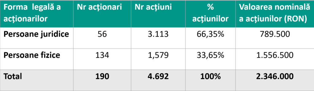 Capitalul social subscris și vărsat al Societății este de 2.346.000 RON, împărțit în 4.692 acțiuni egale, nominative si indivizibile, în valoare egală de 500 lei fiecare, deținute de un număr de 190 de acționari după cum urmează: